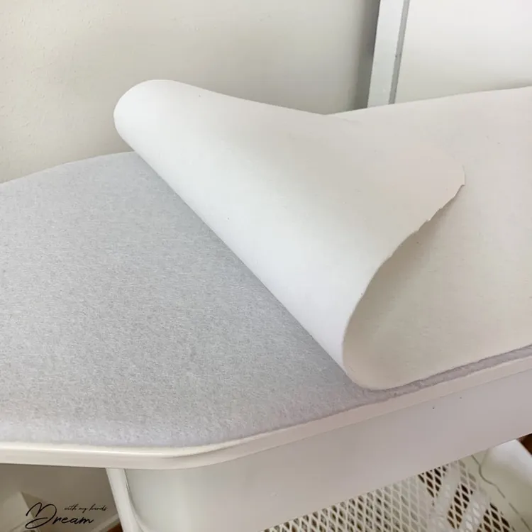 5. 다음으로 다리미판을 함께 제공된 원래 천으로 덮을 수 있습니다. 그러나 그녀는 그것이 약간 얇다고 느꼈기 때문에 직물에 격자 표시를 방지하기 위해 여분의 펠트를 추가했습니다.