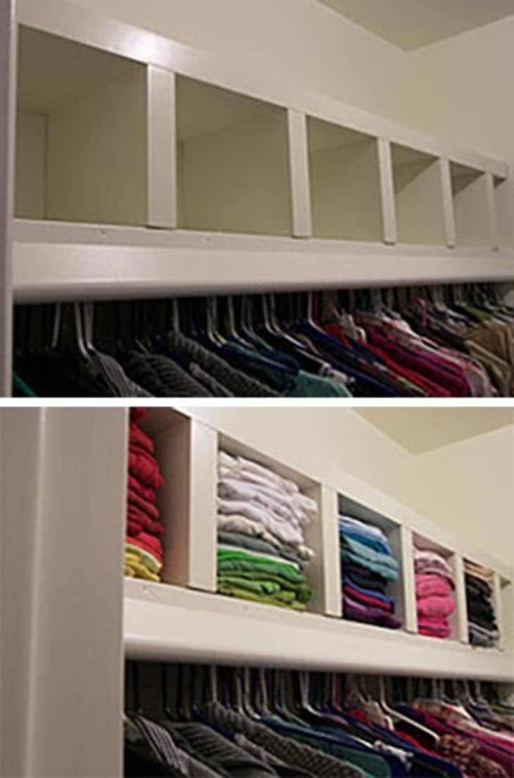세 번째 방법은 LACK 선반을 사용하여 옷장 선반을 정리했습니다. 선반이 충분히 튼튼하다면 옷장을 위한 훌륭한 옵션입니다. 왜냐하면 작은 큐비를 얻을 뿐만 아니라 위에 완전히 새로운 선반을 만들 수 있기 때문입니다.