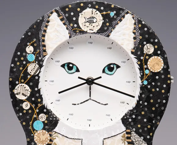 시계 앞 유리를 제거하고 레이저 프린터에서 만든 "NAP"라는 단어로 숫자를 덮고 잘린 얼굴 세부 정보 (눈, 입)를 추가합니다. (여기서 숫자에 붙인 "NAP"은 그녀의 작품 낮잠 자는 고양이의 콘셉트를 표현하기 위해서 붙여놓은 것이에요.)