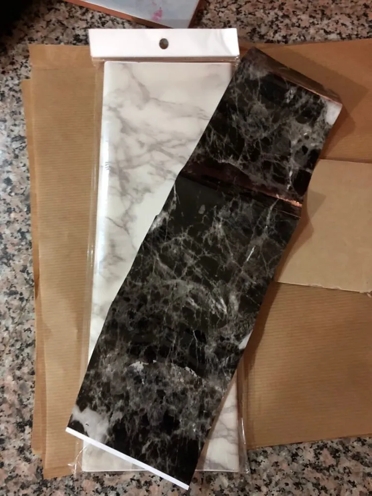 다음으로 트레이에 대리석 시트지 필름을 붙였습니다. 시트지를 붙이기 전에 먼저 테이블을 깨끗이 닦으세요. 왜냐하면 먼지 또는 이물질이 있을 경우 도들 거리 거나, 접착이 잘 안될 수 있습니다. 한쪽 끝에서 시작해서 다른 쪽 끝까지 천천히 부드럽게 부착했습니다.