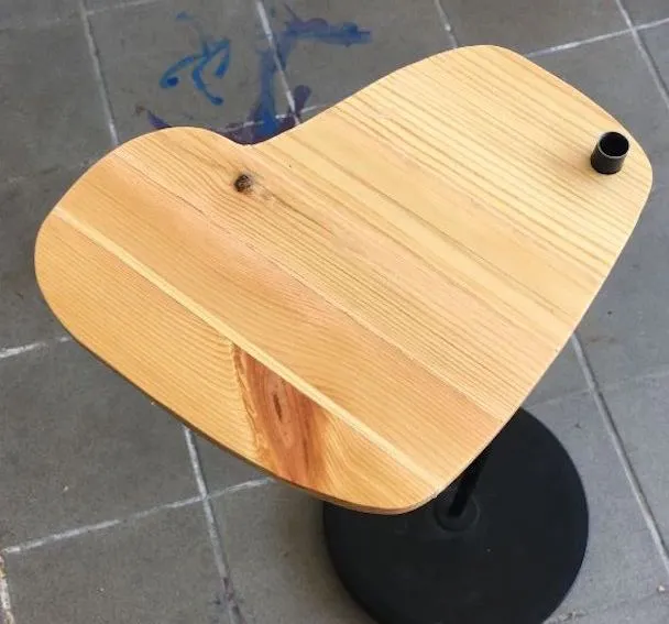Alex made it out of some recycled wood boards. First cut out the desired shelf shape. Then measure the diameter of the floor lamp post. (If possible, drill a smaller diameter than the standard hole.) Use a hole saw to cut the column hole. The hole should not be too large for the column. Otherwise, the supporting part will be weakened. You need to drill a hole to fit it tight. It is best to drill a hole saw (product link) about 19mm and fit it to the stand support.