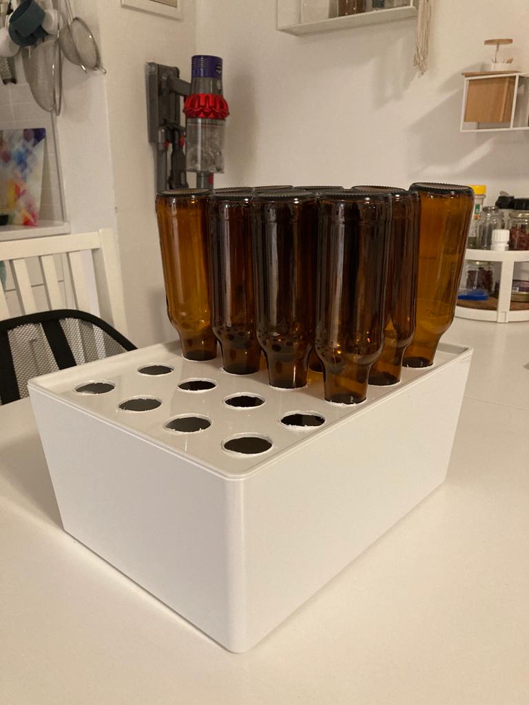 5. 맥주병 건조대를 사용하려면 KUGGIS 상자에 소독액을 채우고 맥주병을 담급니다.