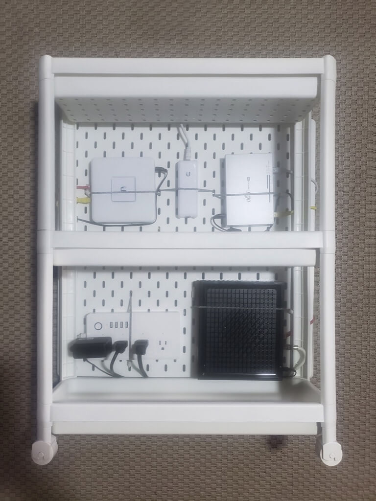 I initially tried to mount the SKÅDIS pegboard into a cheap LAIVA bookshelf, but it was not very aesthetically pleasing to look at, and it defeated my objective of saving space: I now had a random bookshelf occupying even more room. When I next passed by the VESKEN cart again, I deliberated whether or not the difference in widths was that big of a deal: a difference of 0.75″ meant half of that, or 3/8″ sticking out from either side. I decided to give it a shot. The VESKEN cart didn’t look like it could hold up to drilling into either the plastic shelves or the posts, but the SKÅDIS was riddled with holes, so I decided to fasten the pegboard to the cart using zip-ties. From there, I mounted my networking equipment onto the pegboard and stood it up … only to discover the weight of the equipment and power adapters near the back of the entire assembly made it prone to falling backwards.