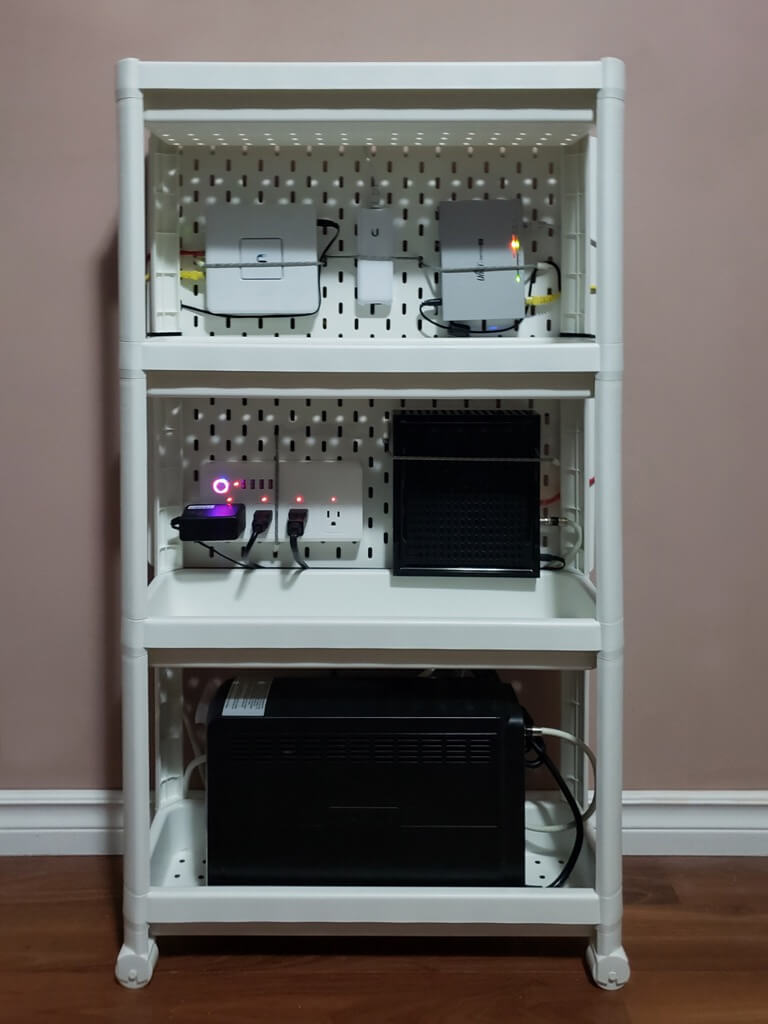 Back to IKEA I went and purchased another VESKEN cart, using only one set of legs and a shelf to raise the cart by another tier, and I placed a UPS battery backup at the bottom, ensuring the cart would never tip over. Since assembling my home networking cart, I’ve received multiple requests to build them for others, so I thought I would inspire others to build one for themselves.