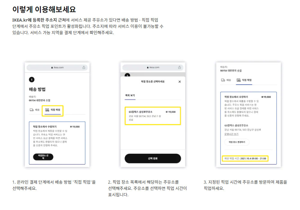 주유소 픽업 서비스는 이케아와 GS칼텍스가 협력하여 배송 가격을 더 낮게 책정하면서 쉽게 대형 가구를 주유소에서 배송받을 수 있게 해주는 방법입니다. 아직은 GS주유소에서만 가능하기에 부족한 부분이 보이지만 계속 주유소와 협의를 해서 픽업 매장을 늘릴 수 있게 준비 중이라고 하니 기대해도 좋을 것 같아요.
