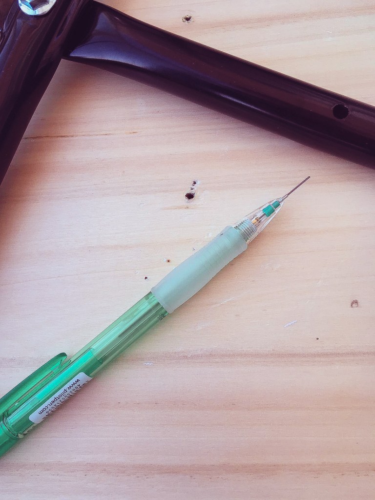Marius 다리를 Snudda 위에 중앙에 놓고 Snudda에 다리를 부착 할 위치를 연필로 표시합니다. Marius 다리의 4 개 구멍 각각을 통해 아래와 같이 길게 심을 뽑을 수 있는 샤프를 사용하면 더욱 쉽습니다. (더 좋은 방법이 있다면 무방합니다.)
