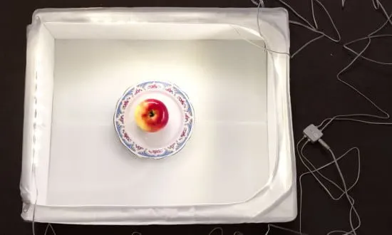 Power up the lights. Place your item in the box and start shooting.