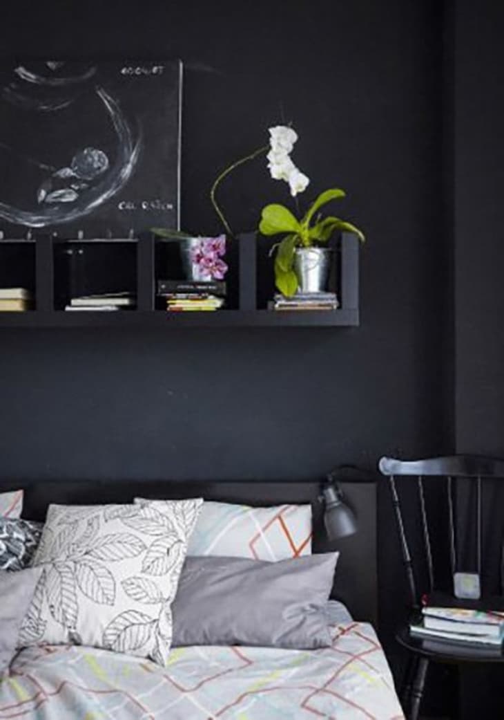 위 : 작은 침실에서 LACK 선반 은 침실 용 탁자와 추가 수납공간으로 사용할 수 있습니다. 너비가 12 인치 미만이므로 침대 바로 옆 구석구석에 넣어 두 번 사용할 수 있습니다. IKEA의 이미지.