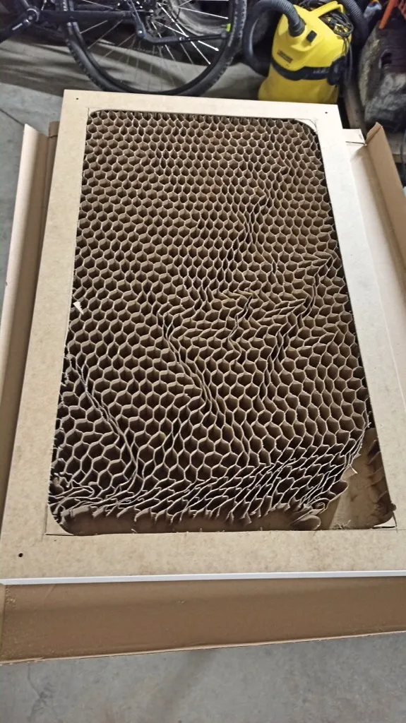 3. 망사를 제거한 후 잘라낸 보드를 탁자 밑면에 붙여 더 강한 표면을 만듭니다.